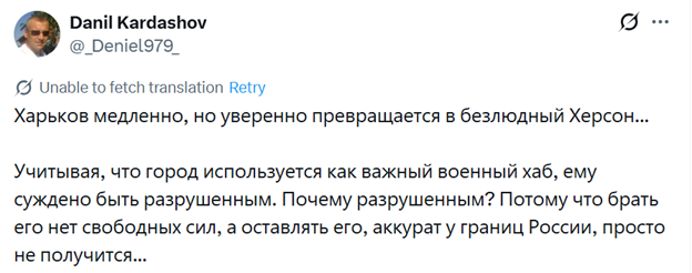 “Kharkiv is slowly but surely turning into a deserted Kherson… Given that the city is being used as an important military hub, it is bound to be destroyed. Why destroyed? Because there are no free troops to take it, while leaving it, right on Russia’s borders, is simply not an option…”